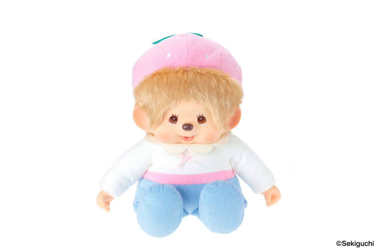 やわらかいボディのLサイズはケーキをイメージしたロンパースに、いちごのお帽子がポイント。