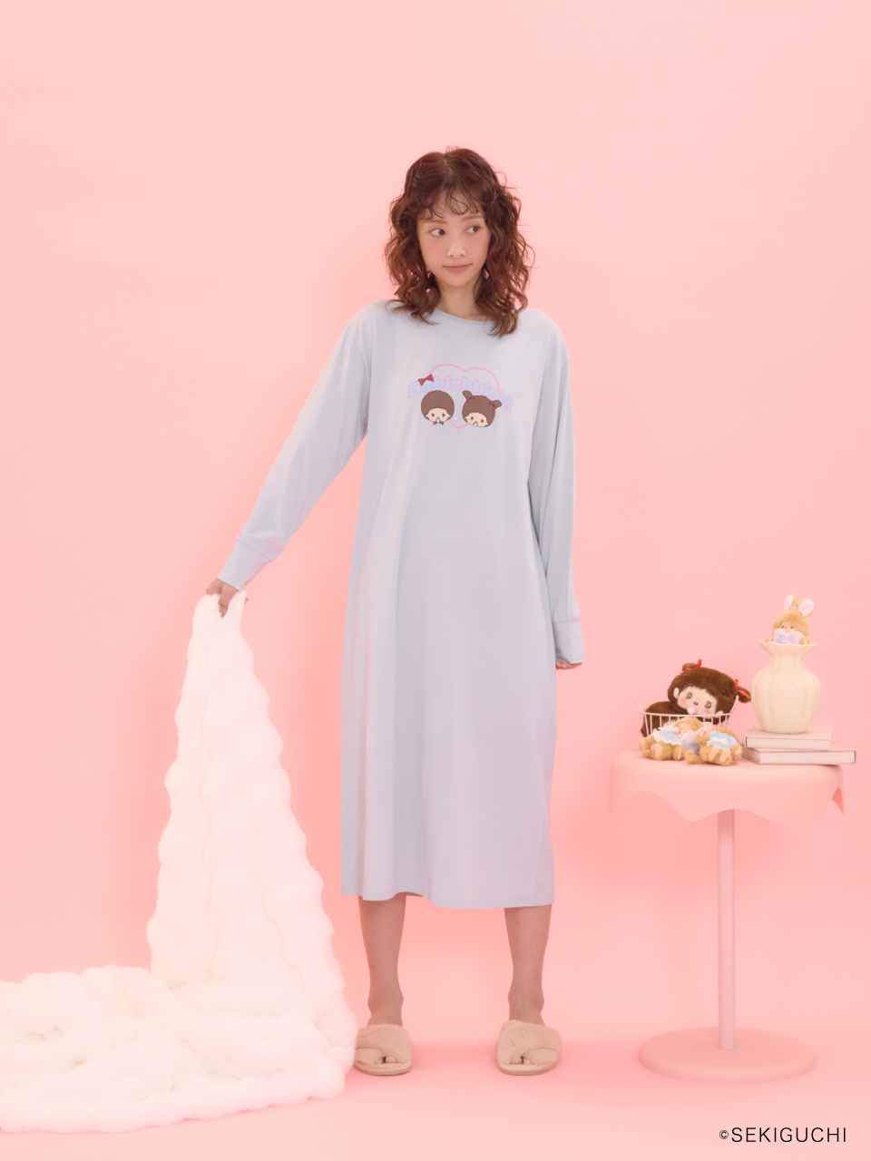今回のコラボレーションでは、注目度の高いベビチッチを起用し、ルームウェアとしておすすめなワンピース、セットアップ、顔型ポーチの3型を展開いたします。