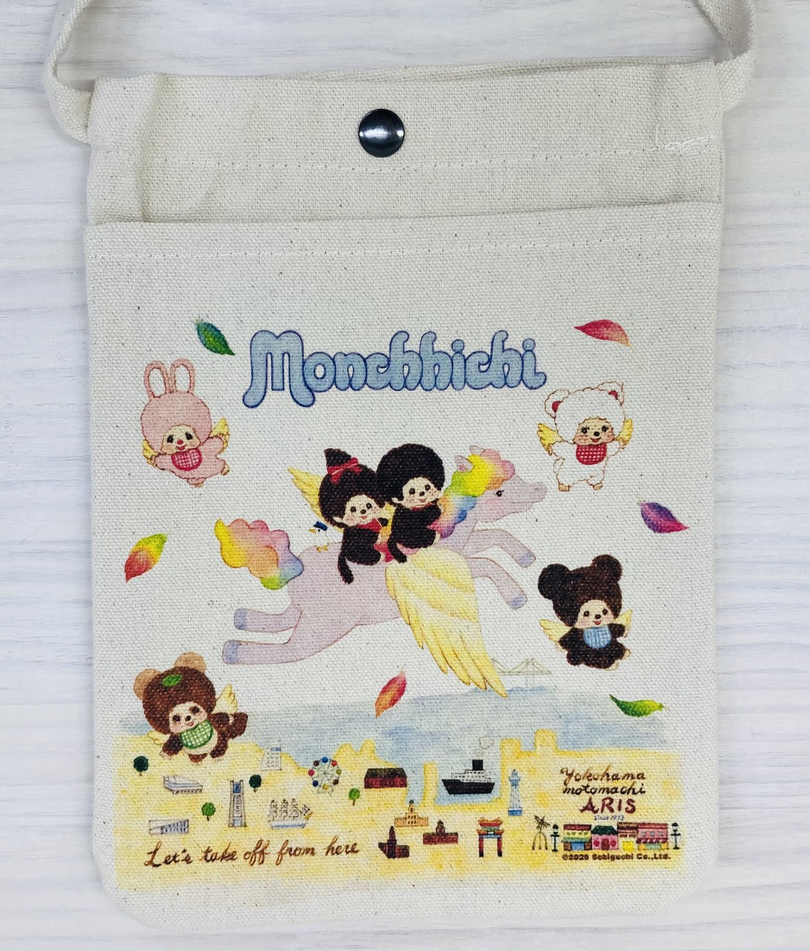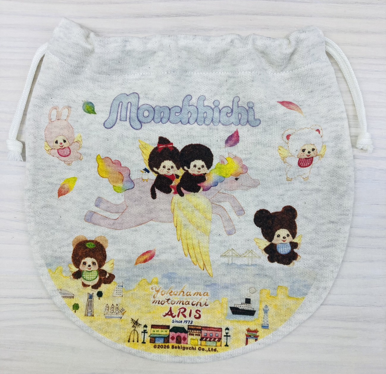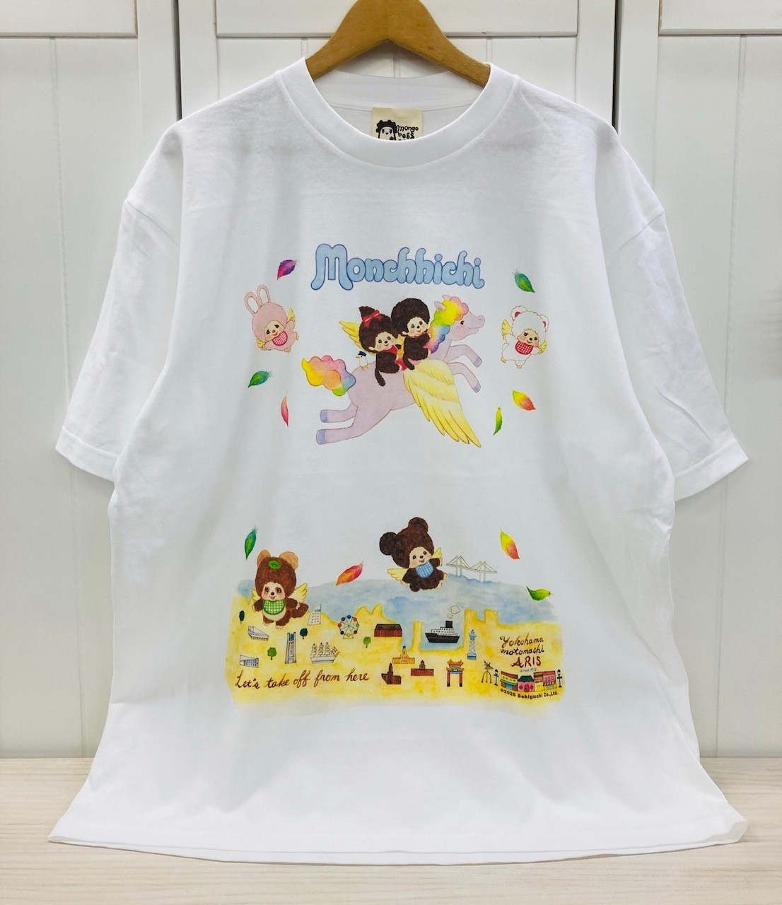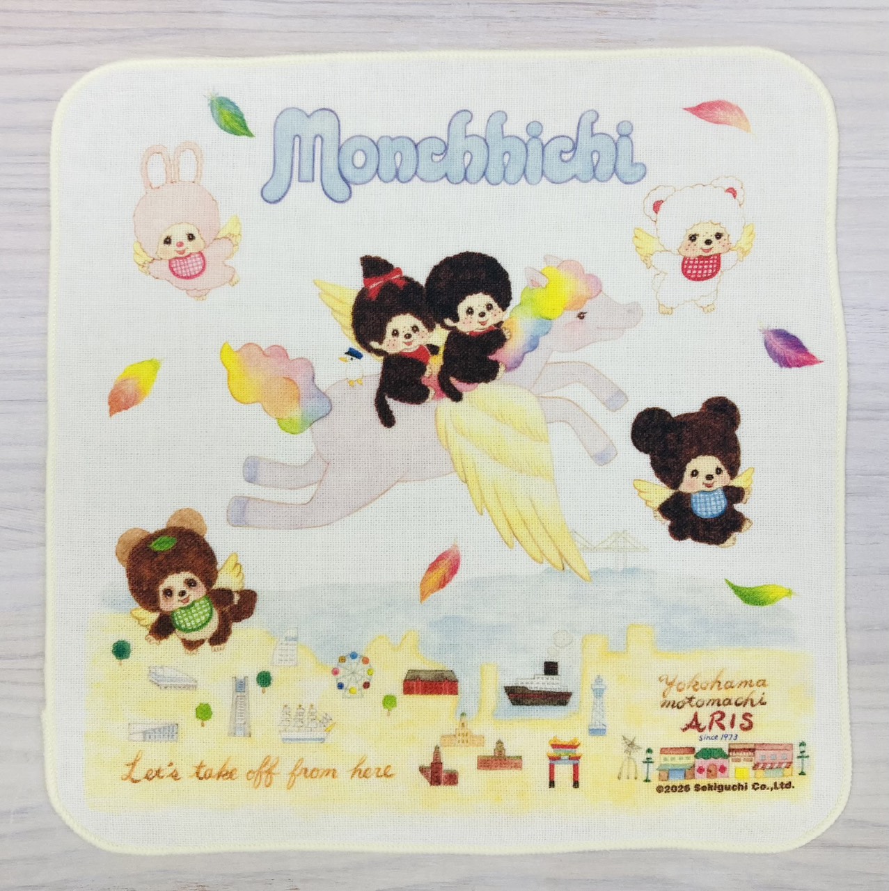 モンチッチくんとモンチッチちゃんがペガサスに乗って横浜の街を見ながら楽しそうに飛んでいるかわいいイラストです♪