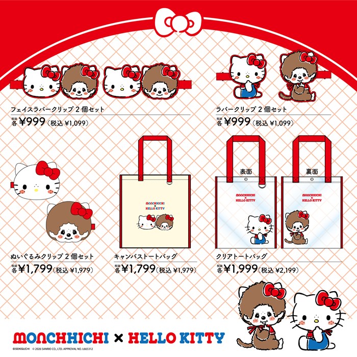 おそろいの赤いリボンをつけたモンチッチとハローキティがとってもかわいい、イラストを用いたTシャツ・パーカー、ショートパンツ、長袖ジャージ上下セットの7アイテムを発売!